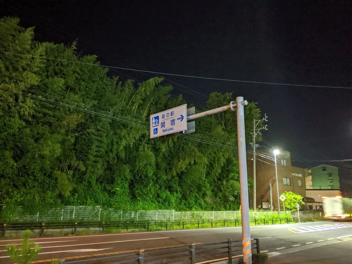 夜間のため熊が出ないか?野良犬が出ないか?ビビりながら登坂を続け、最後に坂を下って無事に関宿へ